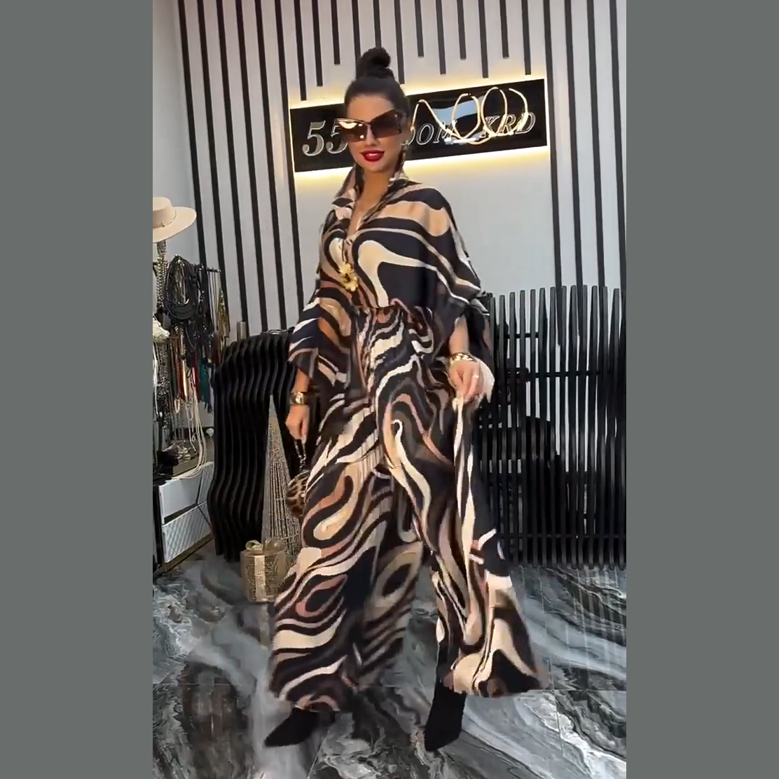Encabezado emocional: Cuando una prenda habla por sí sola, lo único que necesitas es ponértela y dejar que te acompañe. Este diseño fluido y sofisticado, con su estampado en tonos tierra y negro, combina estilo y comodidad para que te sientas segura y radiante en cualquier momento.