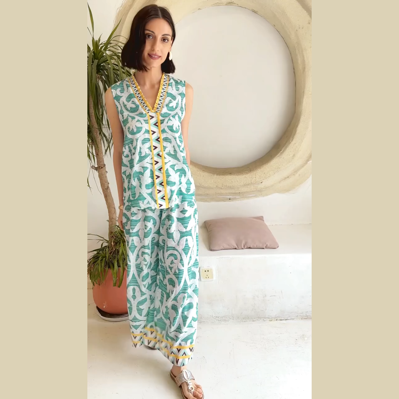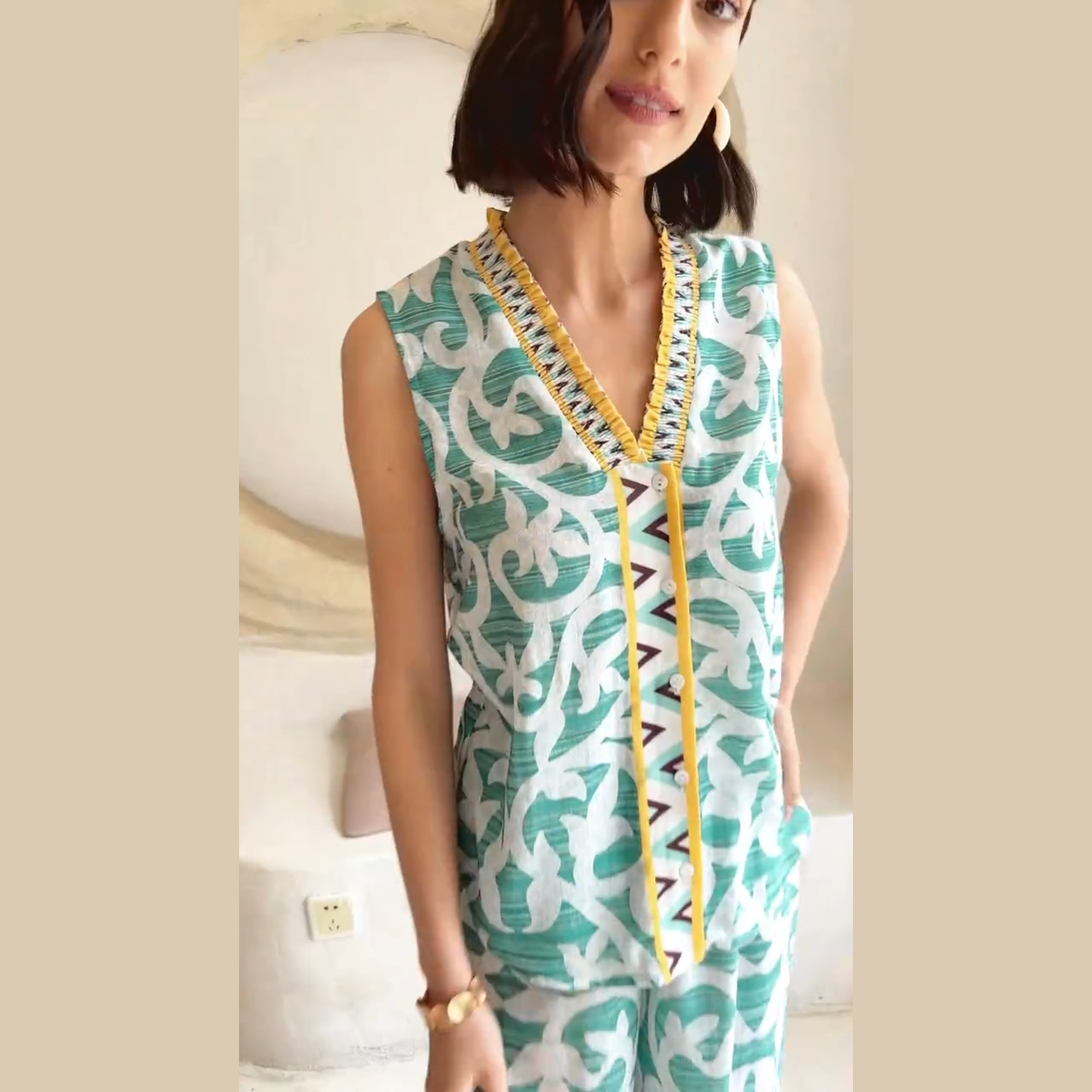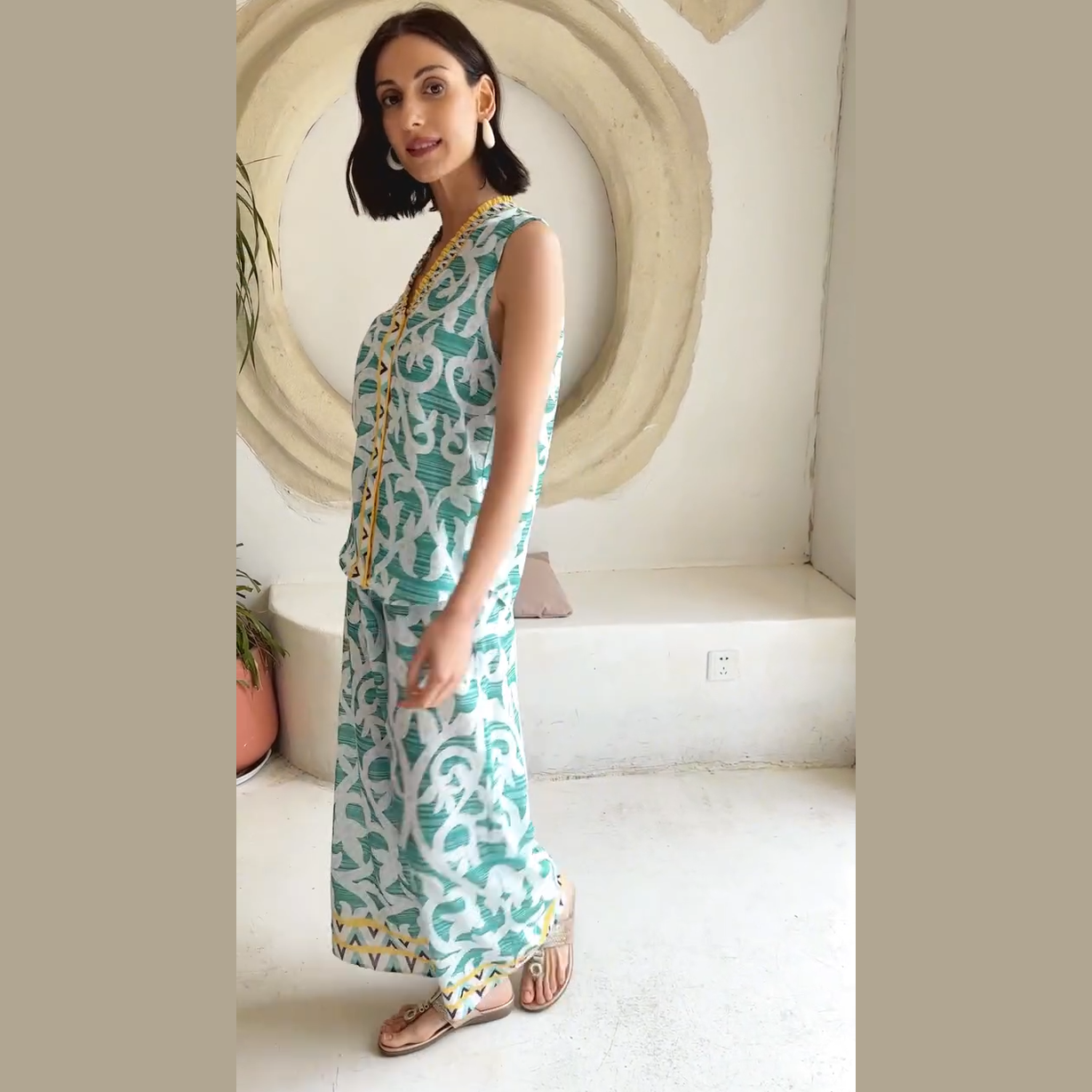 Hay prendas que no solo vistes, sino que sientes. Este conjunto de dos piezas, con su vibrante estampado en tonos turquesa y detalles en amarillo, es como un soplo de aire fresco que te acompaña allá donde vayas. Perfecto para esos días en los que quieres sentirte ligera, cómoda y llena de energía.