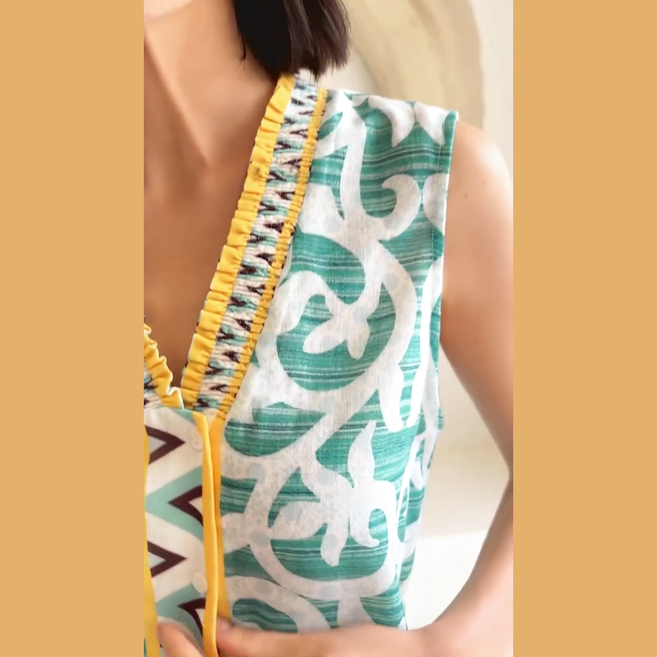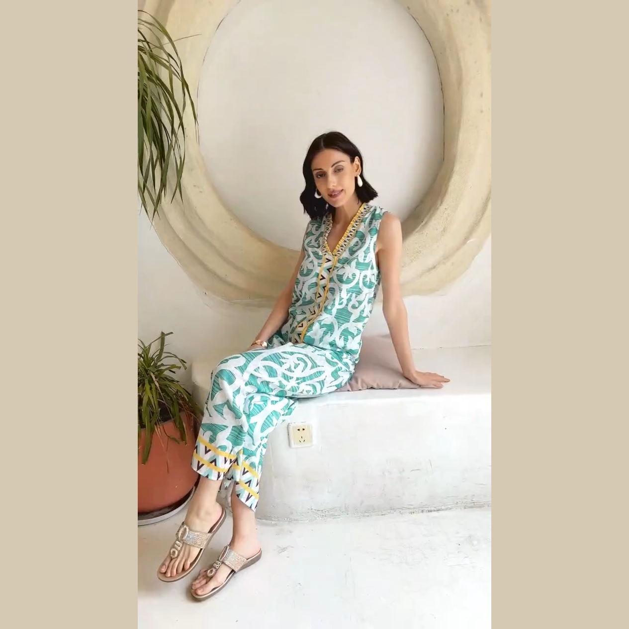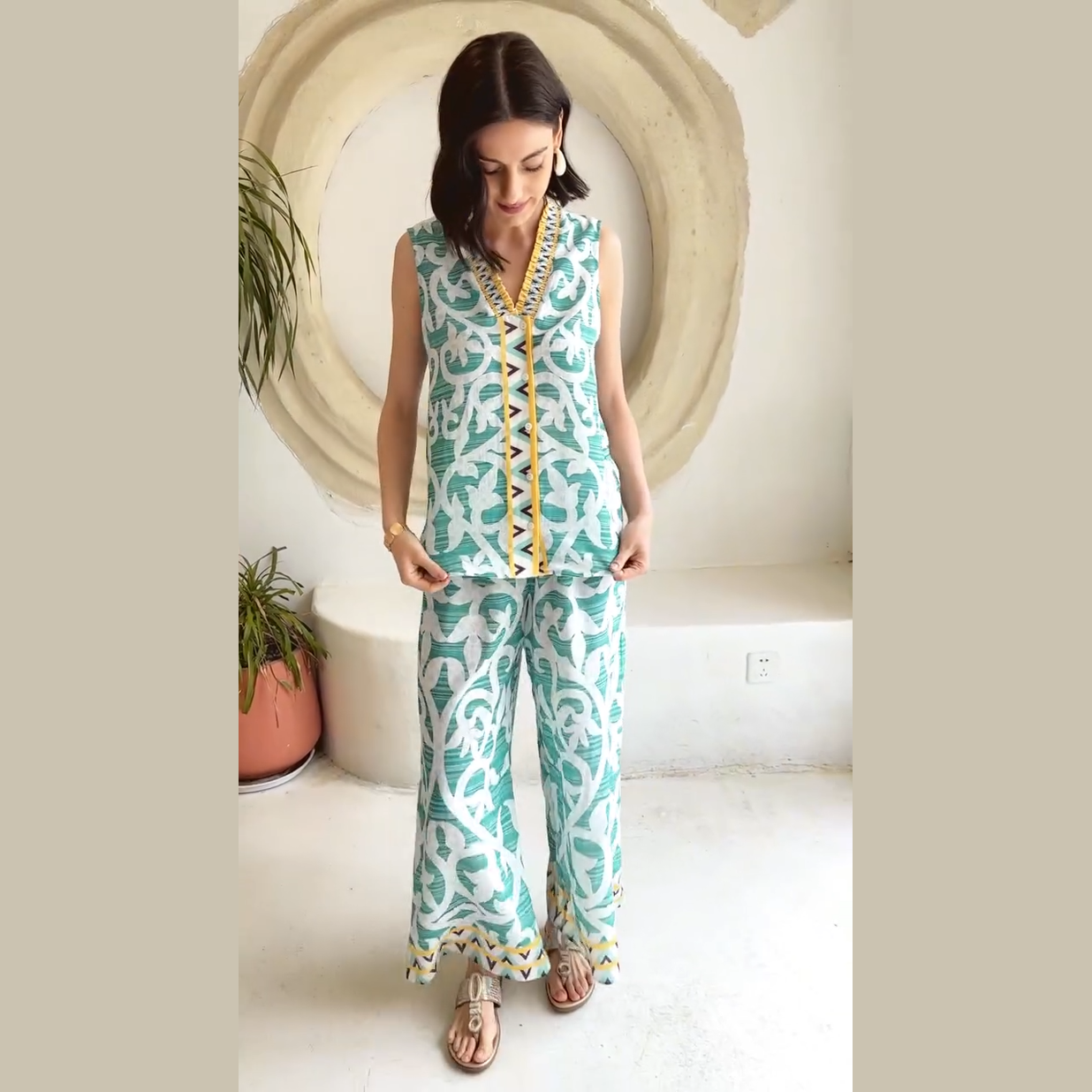 Hay prendas que no solo vistes, sino que sientes. Este conjunto de dos piezas, con su vibrante estampado en tonos turquesa y detalles en amarillo, es como un soplo de aire fresco que te acompaña allá donde vayas. Perfecto para esos días en los que quieres sentirte ligera, cómoda y llena de energía.