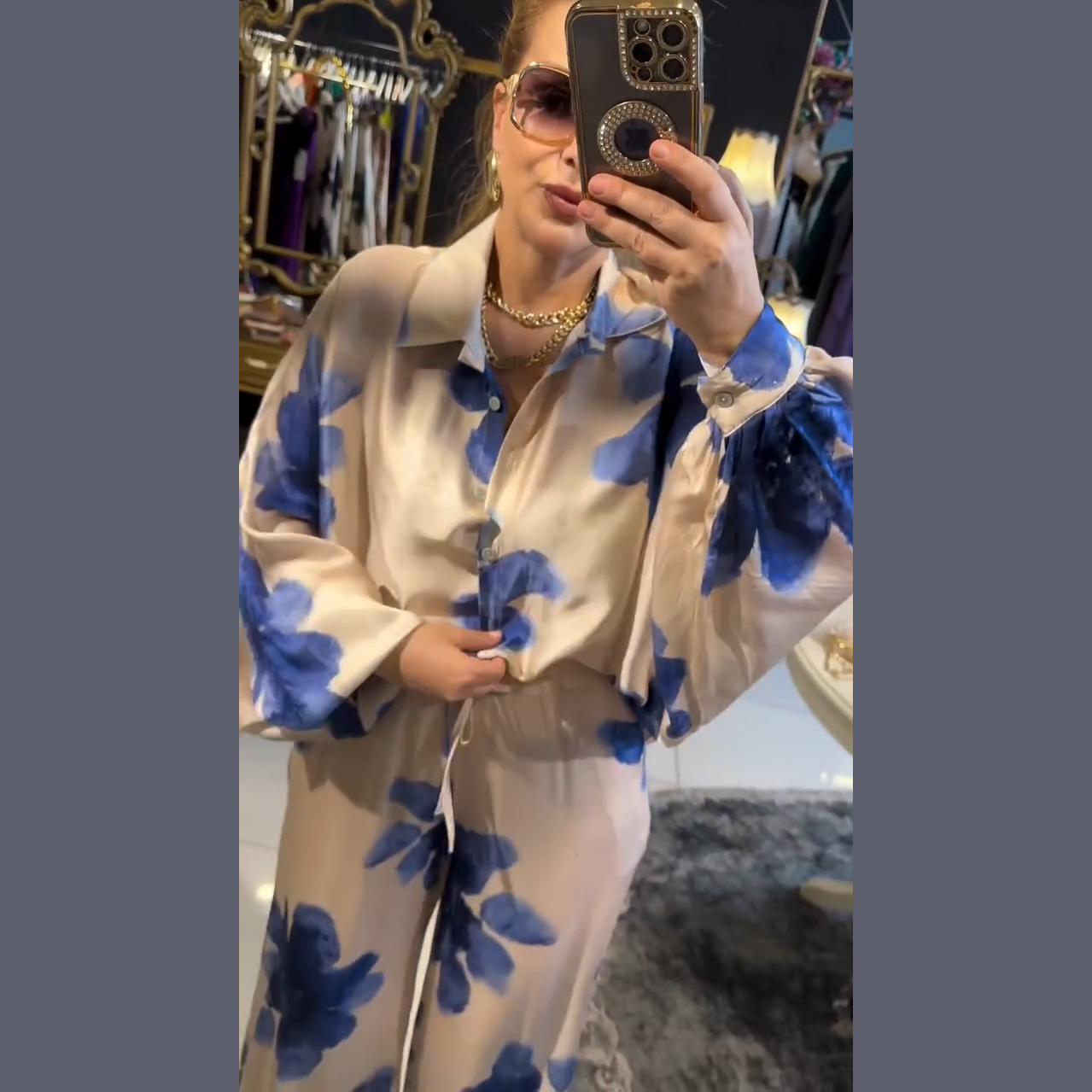 Este conjunto de blusa fluida y pantalón palazzo, con estampado floral en gran formato, es la mezcla perfecta entre frescura y sofisticación. Su tejido satinado aporta un brillo sutil y delicado, mientras que el corte holgado estiliza y permite libertad de movimiento.