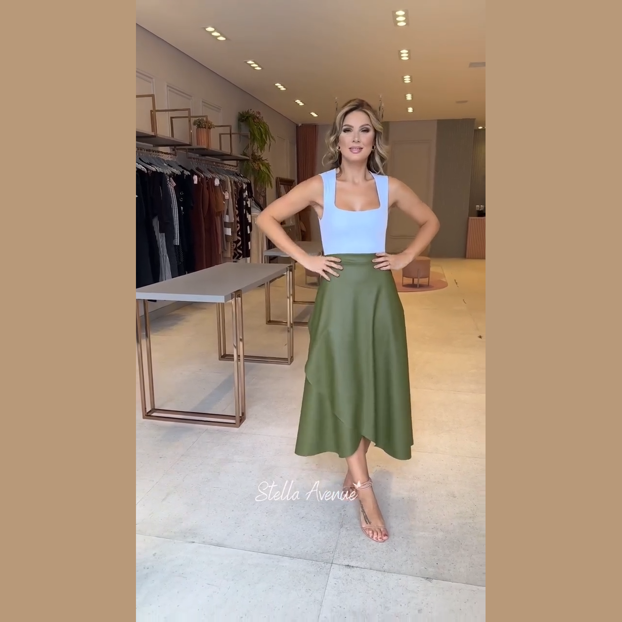 Siente la libertad de moverte con estilo y la comodidad de una prenda que siempre favorece. Nuestra falda cruzada con corte midi está diseñada para acompañarte en cada paso, aportando un aire sofisticado y femenino sin esfuerzo.