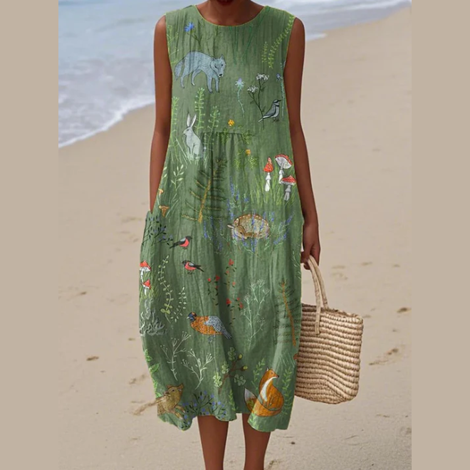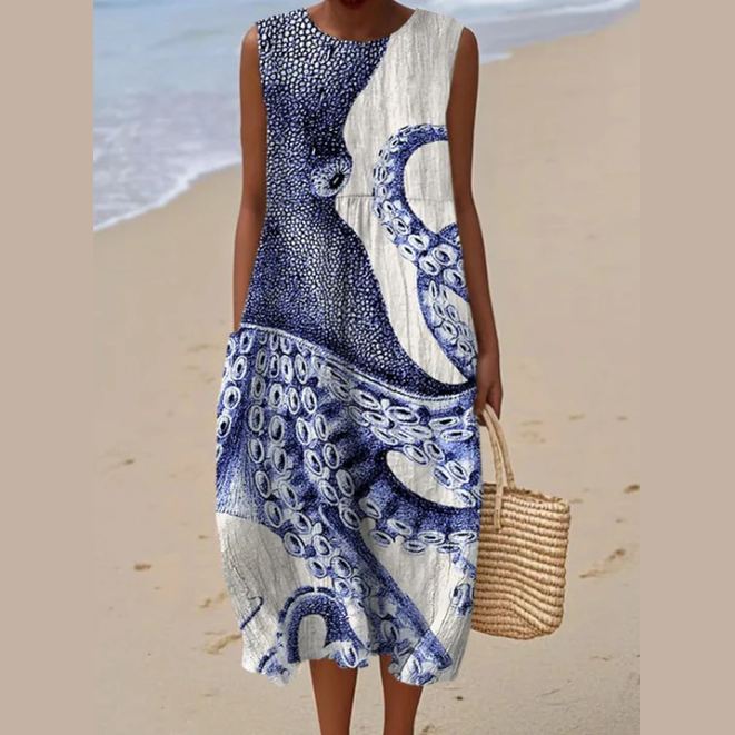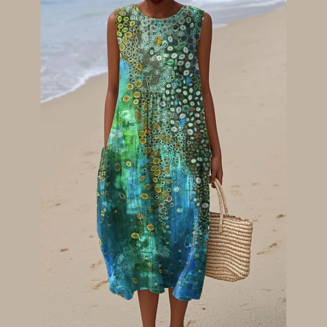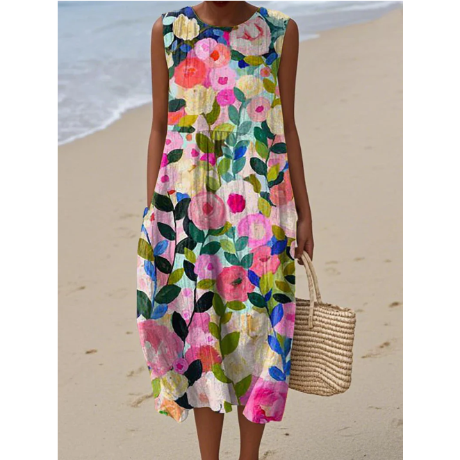 Imagina caminar por la arena, sentir la brisa del mar y moverte con total libertad… Este vestido sin mangas de corte amplio es tu compañero perfecto para disfrutar los días soleados con estilo y comodidad.