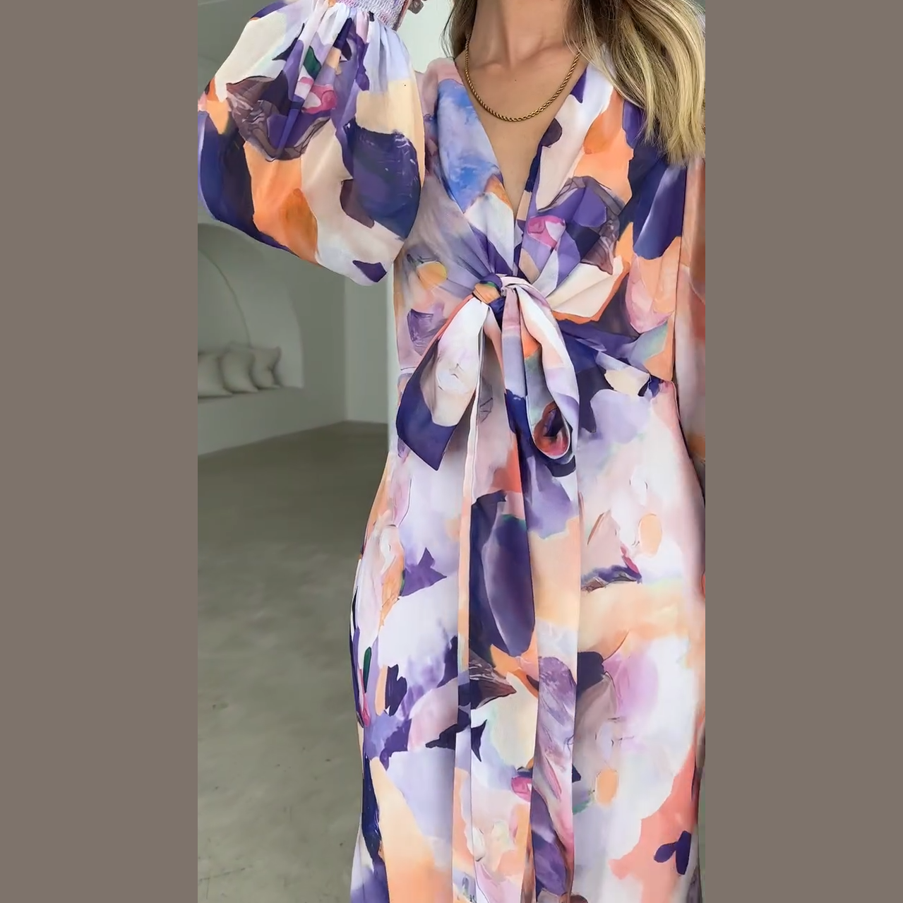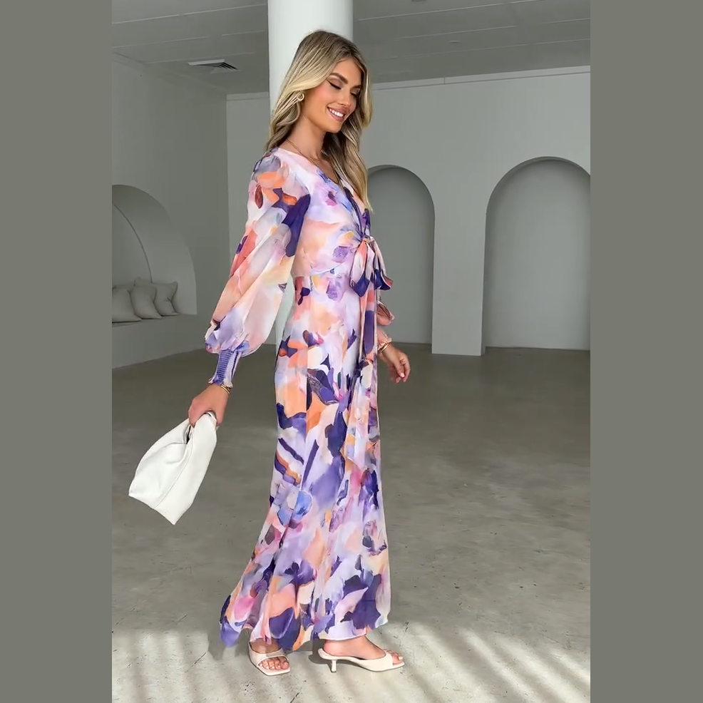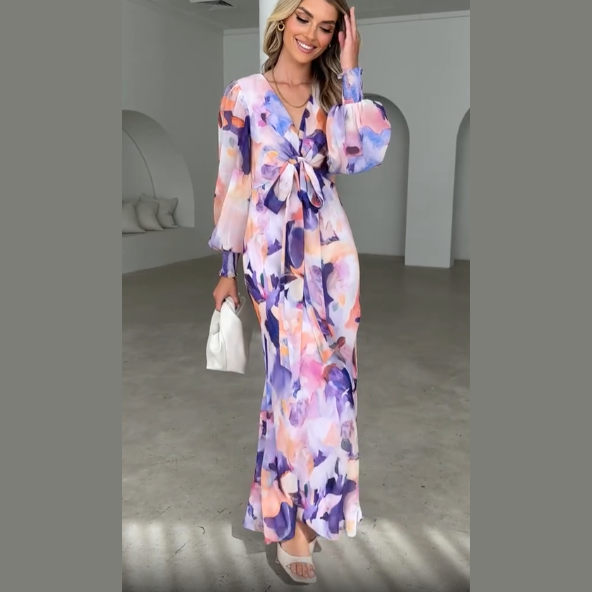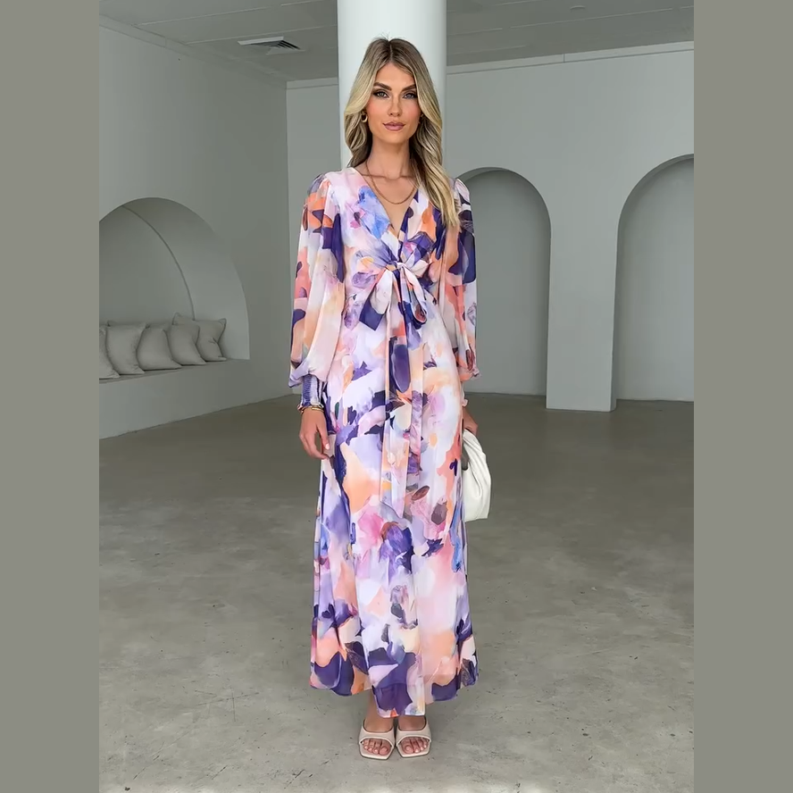 Este vestido largo estampado con lazo frontal es la definición de elegancia fresca. Con su estampado acuarelado en tonos lilas, rosas y melocotón, aporta luz y alegría a cualquier ocasión. La caída fluida de su tejido y el diseño cuidado hacen que te sientas cómoda y radiante de día o de noche.